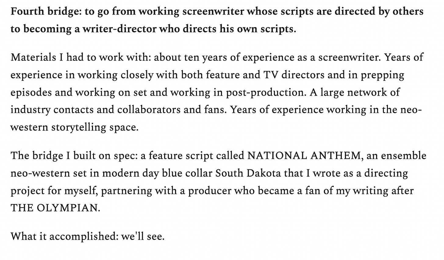Last year I wrote a substack post titled “When Do I Stop Writing Scripts For Free?” Basically, it outlined my strategy in building my career one spec script at a time, with each new spec script — written for free, on my own — designed to be a bridge to carry me to what I wanted the next stage of my career to be.