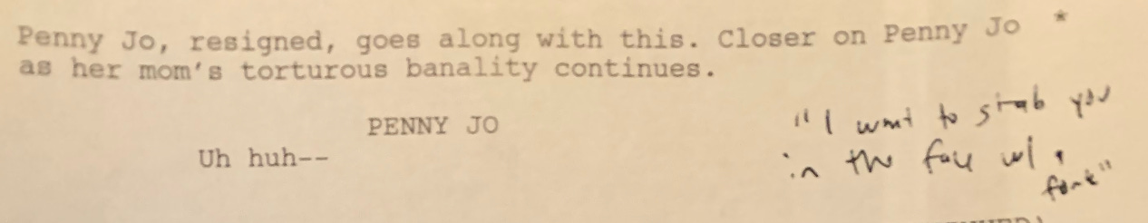 The above is a snapshot of what I mean. The scripted line is simply “Uh huh—.” But what I’ll be encouraging the actress to play is “Mom, I want to stab you in your face with a fork.”